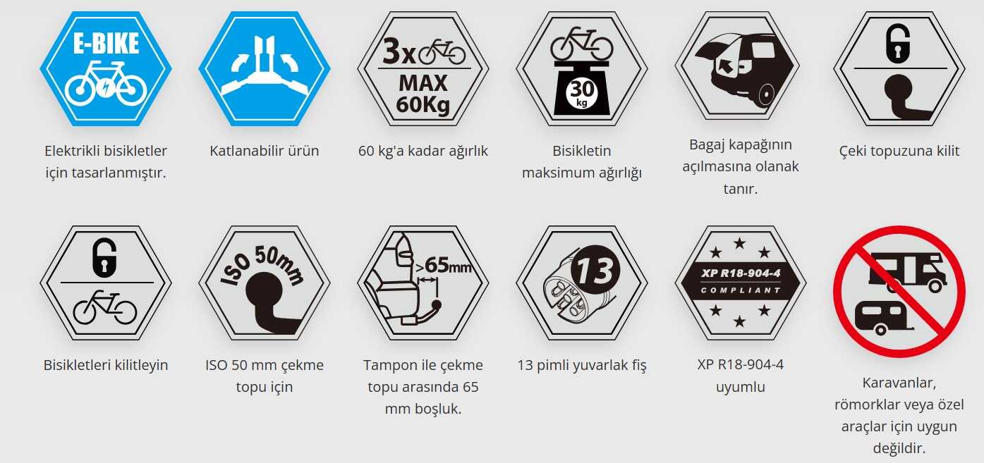 Işıklar: Bu portbagaj standart 5 fonksiyonlu ışıklar ve 13 pinli fiş ile birlikte verilir. Elektrik adaptörleri 7 pinli sistemlere sahip olanlar için mevcuttur.