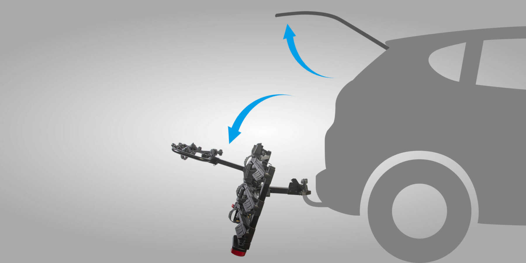 Bagaj kapağına erişim için aşağı eğme: plaka desteğinin arkasındaki kolu çekerek platformu hafifçe eğebilir veya eğme mekanizmasını çalıştırmak için plakanın altını itebilirsiniz. Bu iyi dengelenmiş mekanizma sayesinde, tam yükle bile rafı eğmek için bisikletlerin tüm ağırlığını desteklemek zorunda kalmayacaksınız.